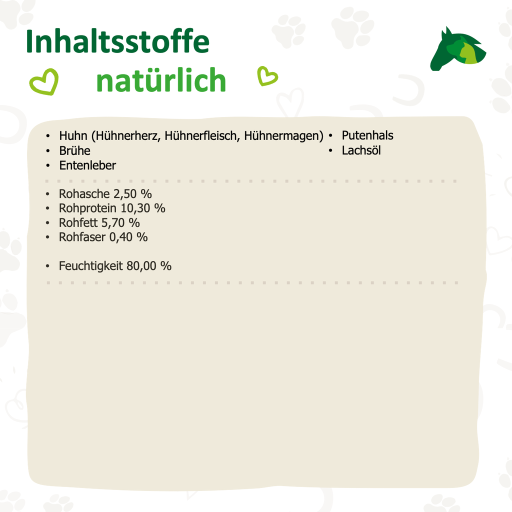 Dabei folgen wir konsequent unserer Philosophie: Keine Kompromisse bei der Qualität, keine unnötigen Zusätze. Nehls Geflügeltöpfchen ist garantiert getreidefrei, glutenfrei, zuckerfrei und laktosefrei. Synthetische Zusatzstoffe, künstliche Aromen, Geschmacksverstärker, Farb- oder Konservierungsstoffe haben in diesem Futter keinen Platz. Die Versorgung mit wichtigen Mineralstoffen, Spurenelementen und Vitaminen erfolgt ausschließlich über die natürlichen Zutaten selbst – so, wie es in der Natur vorgesehen ist.