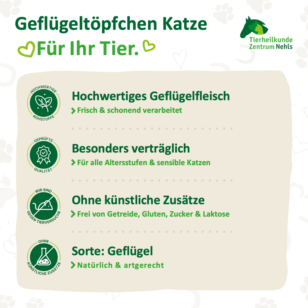 Eine artgerechte Ernährung ist die Grundlage für Vitalität, Lebensfreude und ein langes, gesundes Katzenleben. Gerade Katzen, die sensibel auf Futter reagieren oder mit Magen-Darm- oder Hautproblemen zu tun haben, profitieren von einer naturbelassenen, leicht verdaulichen Mahlzeit. Durch den Einsatz von hochwertigem Geflügelfleisch in Lebensmittelqualität und ausgesuchten Innereien liefert Nehls Geflügeltöpfchen nicht nur wertvolle tierische Proteine, sondern auch wichtige Nährstoffe wie natürlich enthaltene Vitamine, Spurenelemente und Mineralstoffe.