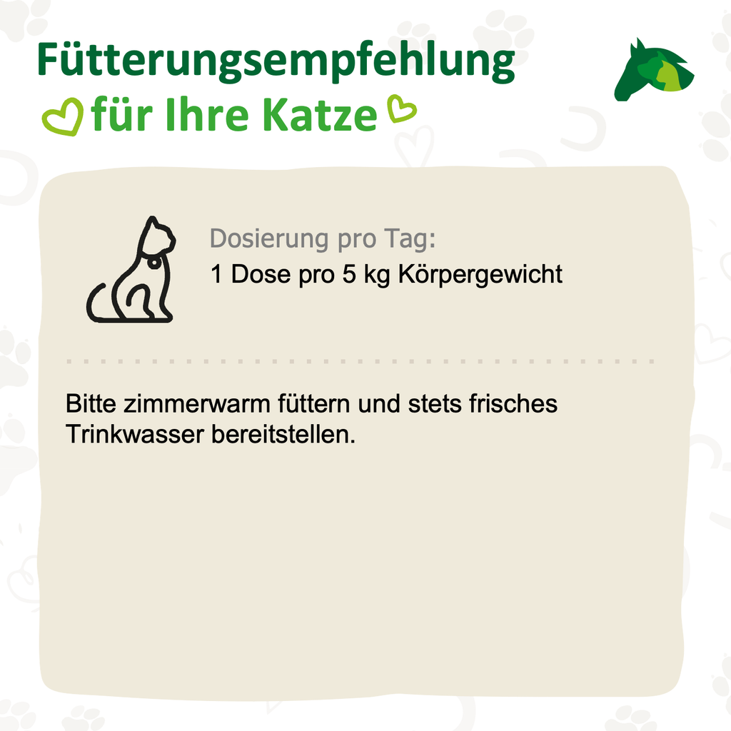 Durch die ausgewogene Zusammensetzung eignet es sich auch hervorragend für sensible Katzen mit empfindlichem Magen-Darm-Trakt oder Hautproblemen. Dabei setzen wir bewusst auf nur eine Proteinquelle pro Mahlzeit, um das Futter besonders verträglich zu machen und dem natürlichen Fressverhalten der Katze gerecht zu werden.