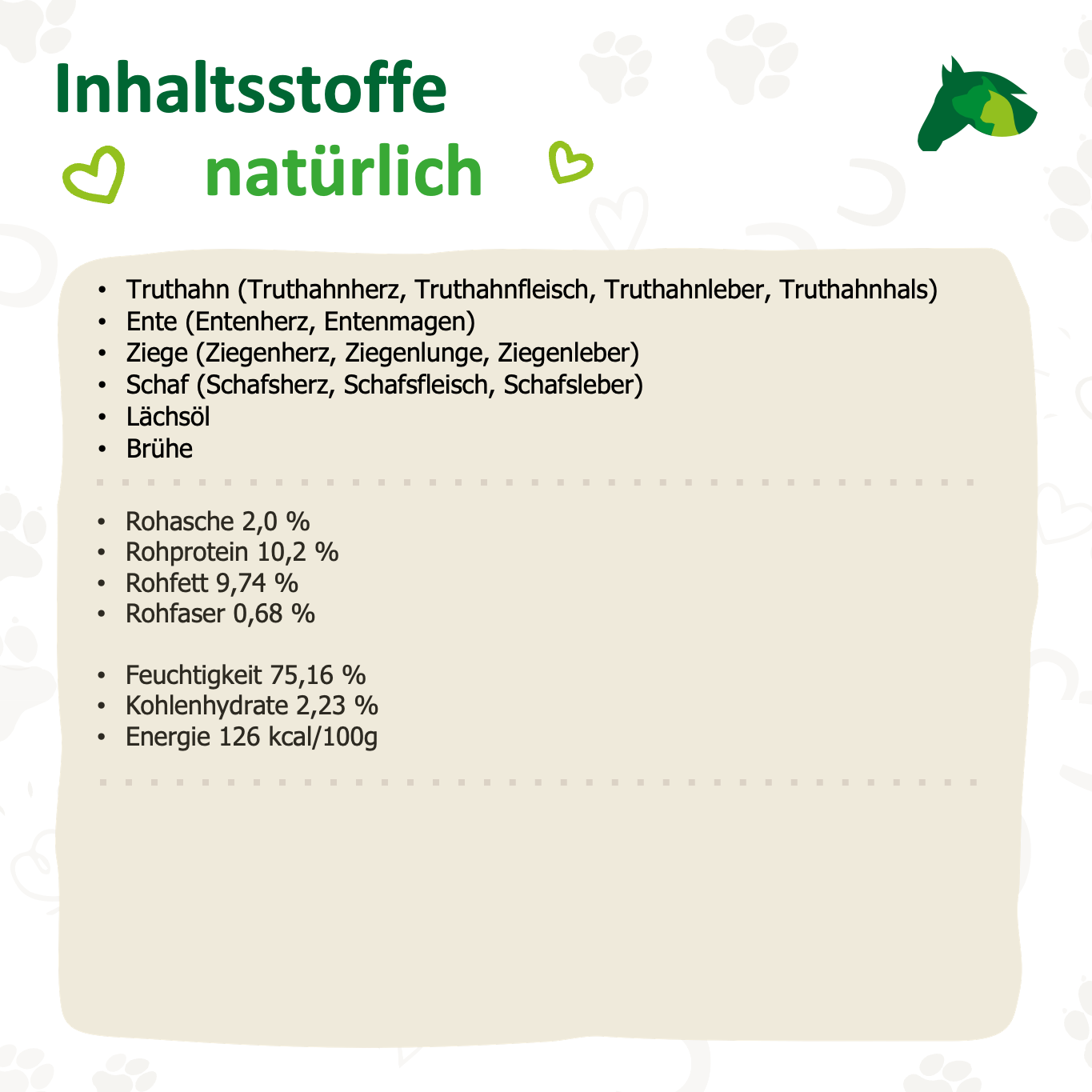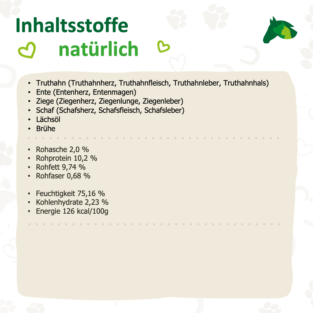 Wie bei allen Nehls Produkten verzichten wir konsequent auf synthetische Zusätze, Getreide, Zucker, Laktose, minderwertige Nebenerzeugnisse oder künstliche Bindemittel. Stattdessen stammen alle Nährstoffe aus frischen, hochwertigen Fleischrohwaren und nährstoffreichen Innereien in Lebensmittelqualität, die den natürlichen Bedarf an Mineralstoffen, Spurenelementen und Vitaminen abdecken.