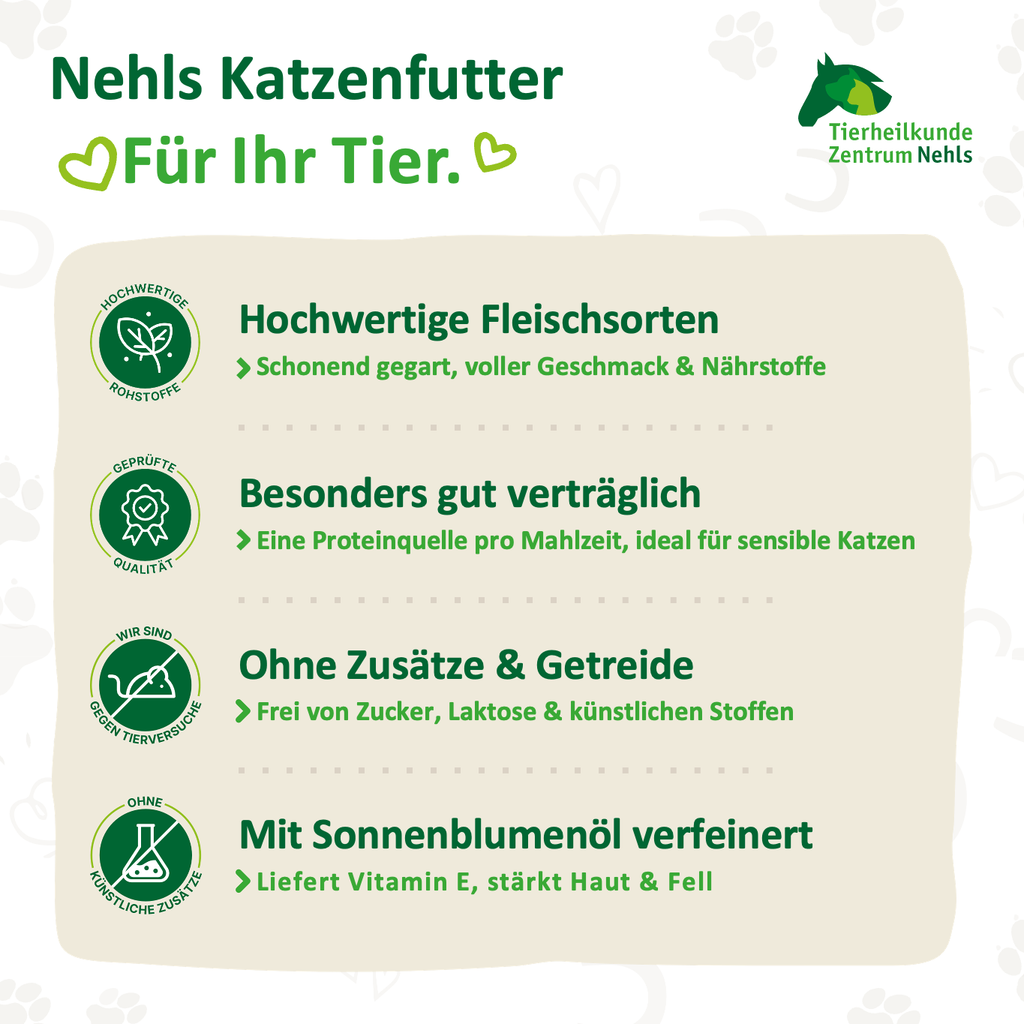 Eines unserer beliebtesten Nassfutter für Katzen vereint hochwertige Fleischsorten in Premiumqualität mit einer schonenden Zubereitung, die den natürlichen Geschmack bewahrt und die Nährstoffe optimal erhält. Nehls Katzenfutter enthält ausschließlich naturreine Zutaten und ist damit besonders leicht verdaulich – ideal für Katzen jeden Alters, vom Kitten bis zur Senior-Samtpfote.