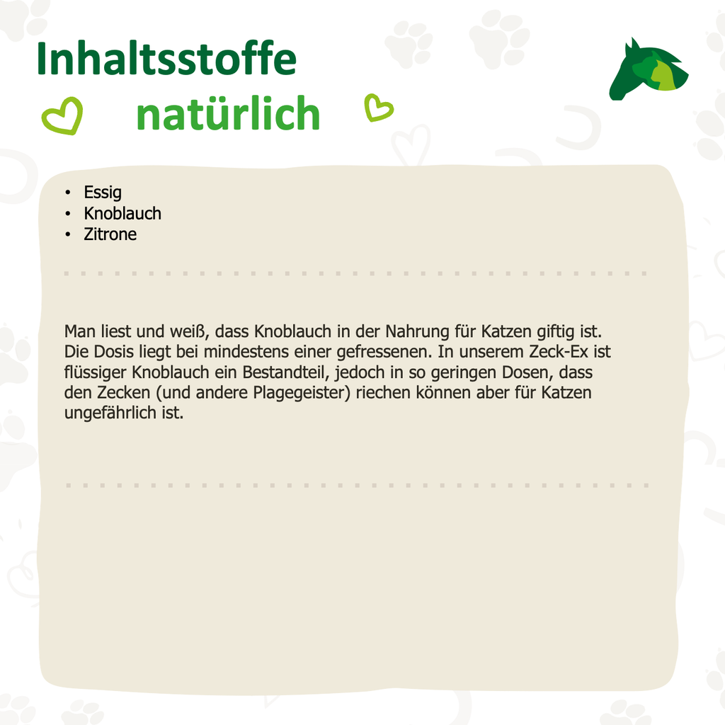 Nehls Zeck-Ex wird in flüssiger Form angewendet und lässt sich einfach und gezielt auftragen. Die Kombination aus ausgewählten Kräuterauszügen und ätherischen Ölen unterstützt auf natürliche Weise das Hautmilieu, stärkt den Hautstoffwechsel und sorgt so für eine Umgebung, in der sich Zecken und andere Parasiten unwohl fühlen. Anders als konventionelle Präparate belastet Nehls Zeck-Ex die Haut nicht, sondern pflegt sie zugleich – ein wichtiger Vorteil, besonders bei Tieren mit sensibler oder allergisch reagierender Haut.