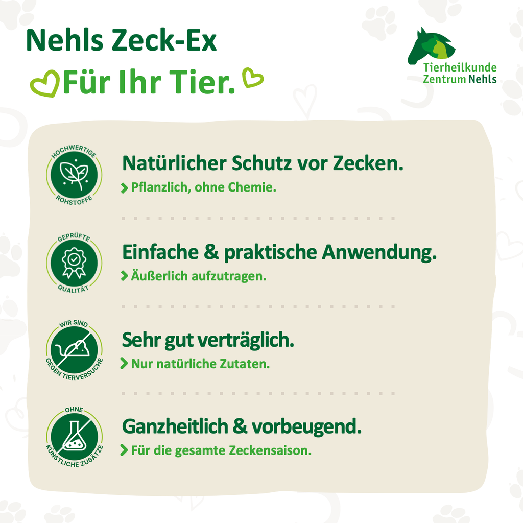 Mit Nehls Zeck-Ex entscheiden Sie sich für eine natürliche, hautfreundliche und zugleich wirksame Unterstützung, die die Abwehrkraft der Haut fördert und das Wohlbefinden Ihres Lieblings stärkt – Tag für Tag.