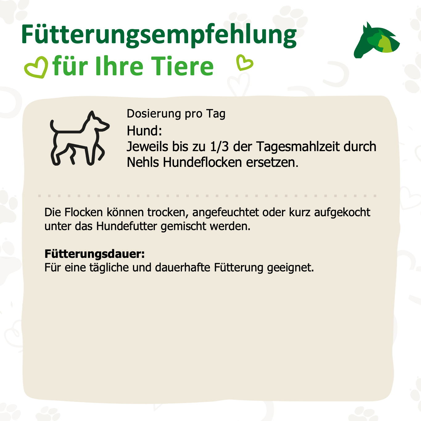 Jeweils bis zu 1/3 der Tagesmahlzeit durch Nehls Hundeflocken ersetzen. Die Flocken können trocken, angefeuchtet oder kurz aufgekocht unter das Hundefutter gemischt werden.