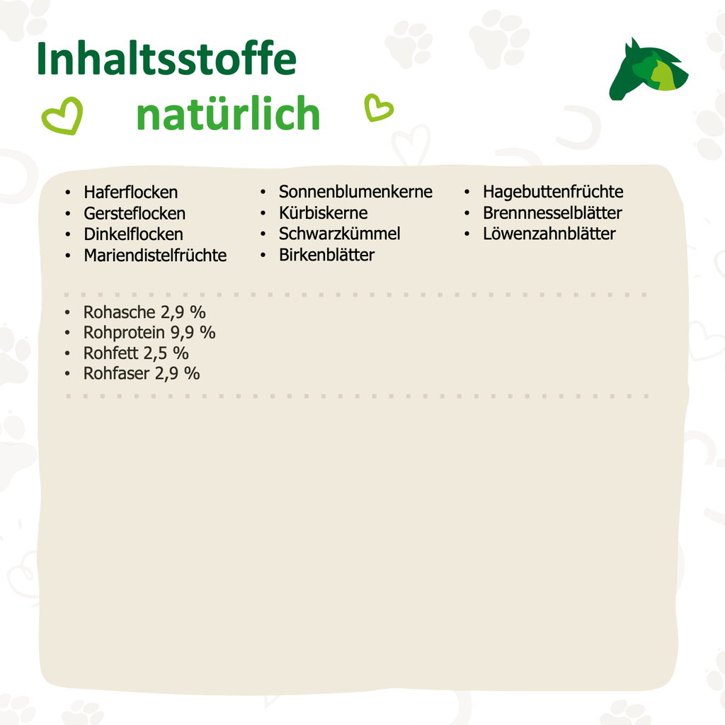 Hydrothermisch aufgeschlossene Haferflocken, Gerstenflocken & Dinkelflocken, Sonnenblumenkerne, Kürbiskerne & Schwarzkümmel, Hagebuttenfrüchte, Brennnesselblätter, Löwenzahnblätter, Mariendistelfrüchte, Birkenblätter