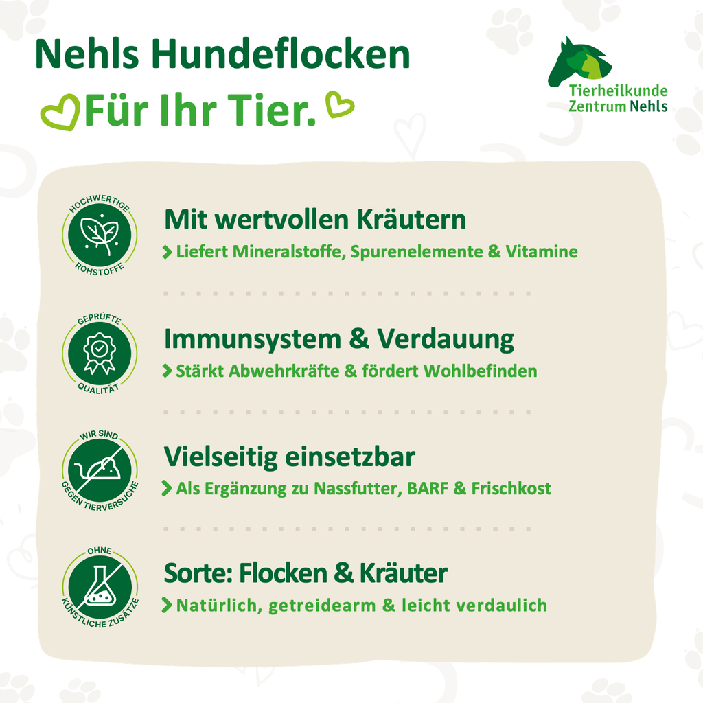 Nehls Hundeflocken & Kräuter sind leicht verdaulich, getreidearm und vielseitig einsetzbar. Sie eignen sich für jede Lebensphase – vom Junghund bis zum Senior – und sind sowohl im Rahmen einer langfristigen Fütterung als auch als gezielte Kur eine wertvolle Ergänzung.