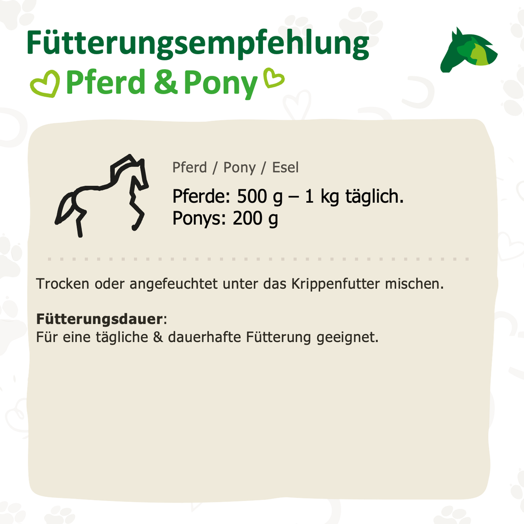 Nehls Pferdefutter ist als Ergänzungsfuttermittel optimal geeignet, kann aber auch als alleiniges Krippenfutter gefüttert werden. Für eine rundum abgestimmte Versorgung empfehlen wir die Kombination mit Nehls Horse Allround Kräuter-Fit.