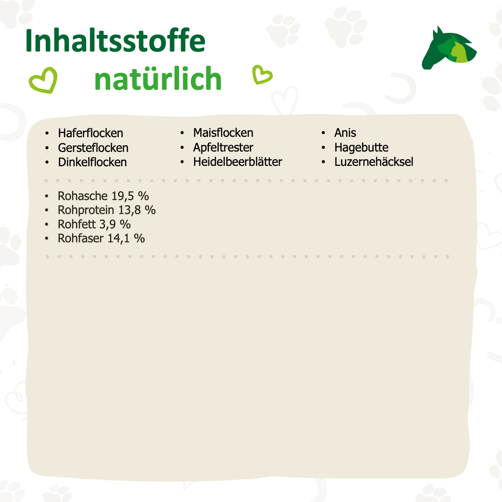 Die Mischung kombiniert einen hohen Rohfaseranteil mit viel Energie und einem passenden Proteingehalt, um Ausdauer, Kraft und Leistungsbereitschaft zu fördern. Die enthaltenen Kräuter liefern auf natürliche Weise essentielle Mineralstoffe, Spurenelemente, Vitamine, Aminosäuren und sekundäre Pflanzenstoffe. So wird der erhöhte Bedarf von Sport- und Turnierpferden optimal gedeckt – ganz ohne synthetische Zusätze.