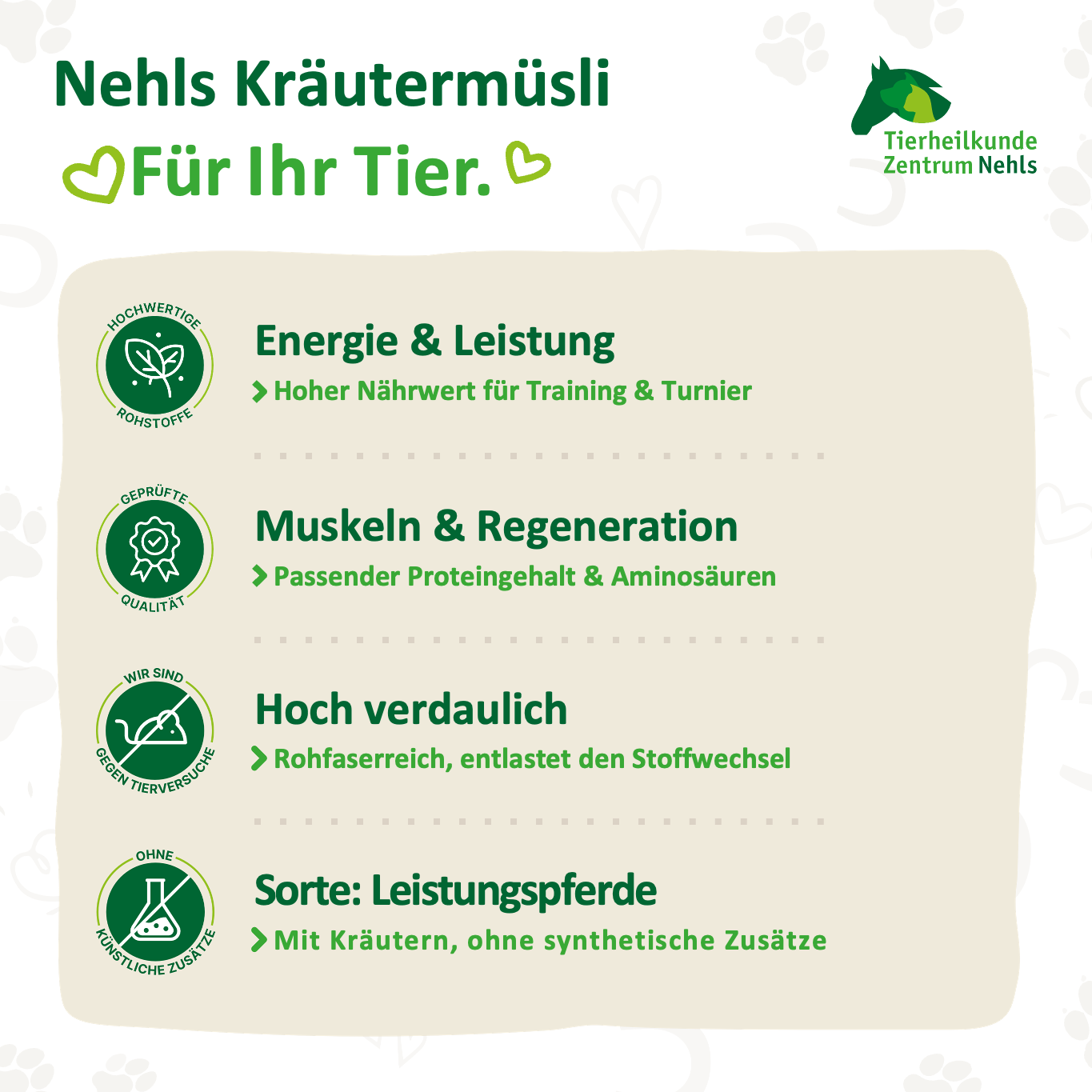 Nehls Kräutermüsli für Leistungspferde ist die ideale Wahl für Pferde, denen im Training oder auf Turnieren Höchstleistungen abverlangt werden. Mit einem besonders hohen, leistungsorientierten Nährwert versorgt es den Organismus ganzjährig bedarfsgerecht – von der Vorbereitungsphase über die Turniersaison bis hin zur Regeneration.