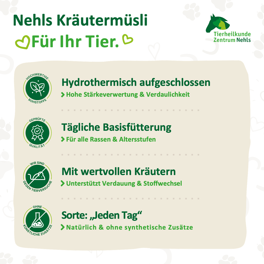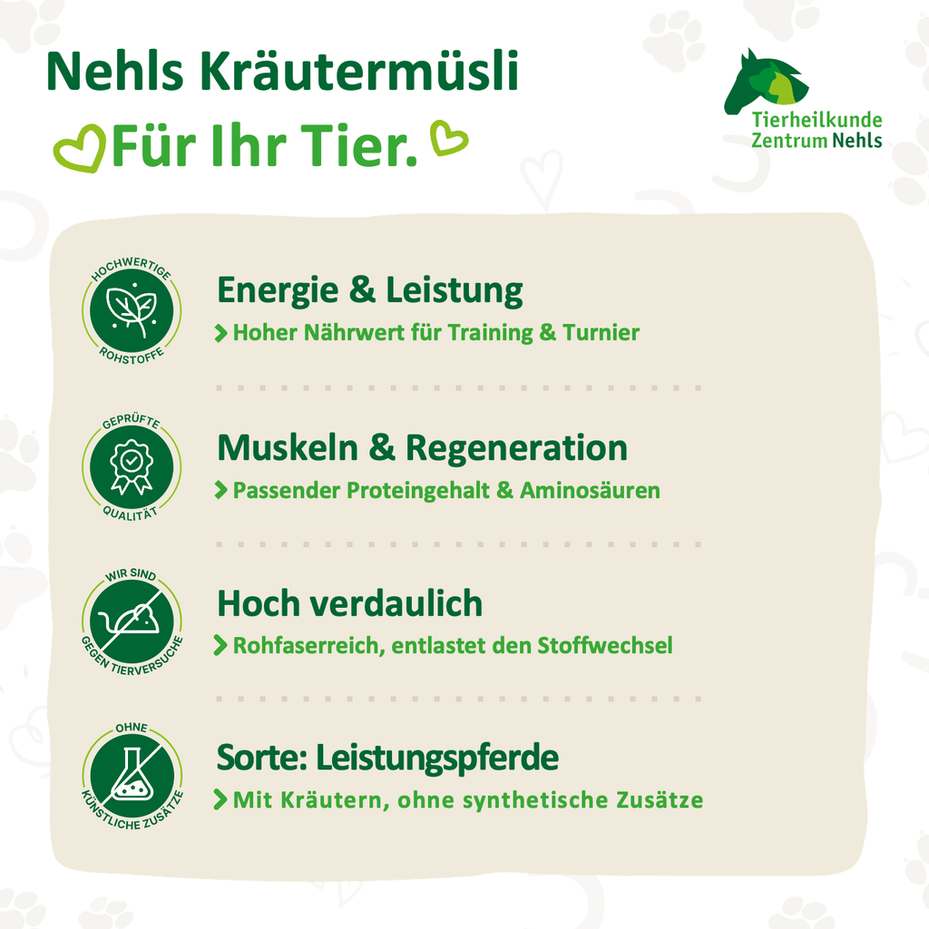 Nehls Pferdefutter ersetzt jedoch nicht die individuellen Nehls Ergänzungsfuttermittel aus Kräutern. Nehls Pferdefutter ist die Basis einer gesunden Pferdefütterung in Verbindung mit qualitativem Heu und den individuell passenden Nehls Kräutern für Pferde, Ponys und Esel.