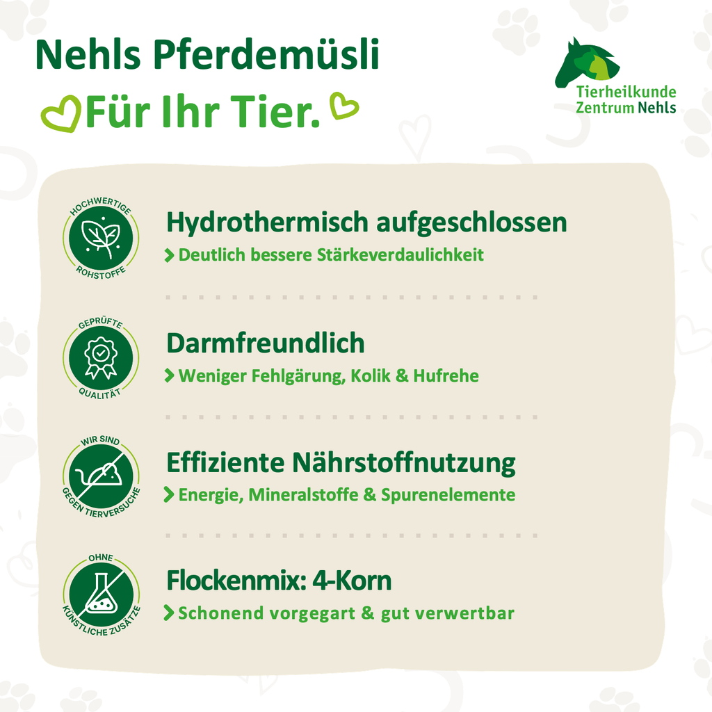 Nehls Pferdefutter ist genfrei, stammt ausschließlich von ausgesuchten Vertragsbauern und kontrollierten Betrieben aus der Region. Im Grunde handelt es sich nicht um ein Pferdefutter, sondern um hochwertige Frühstückscerealien, also um Zutaten, die der Mensch in seinem Müsli erster Qualitätsstufe vorfindet.