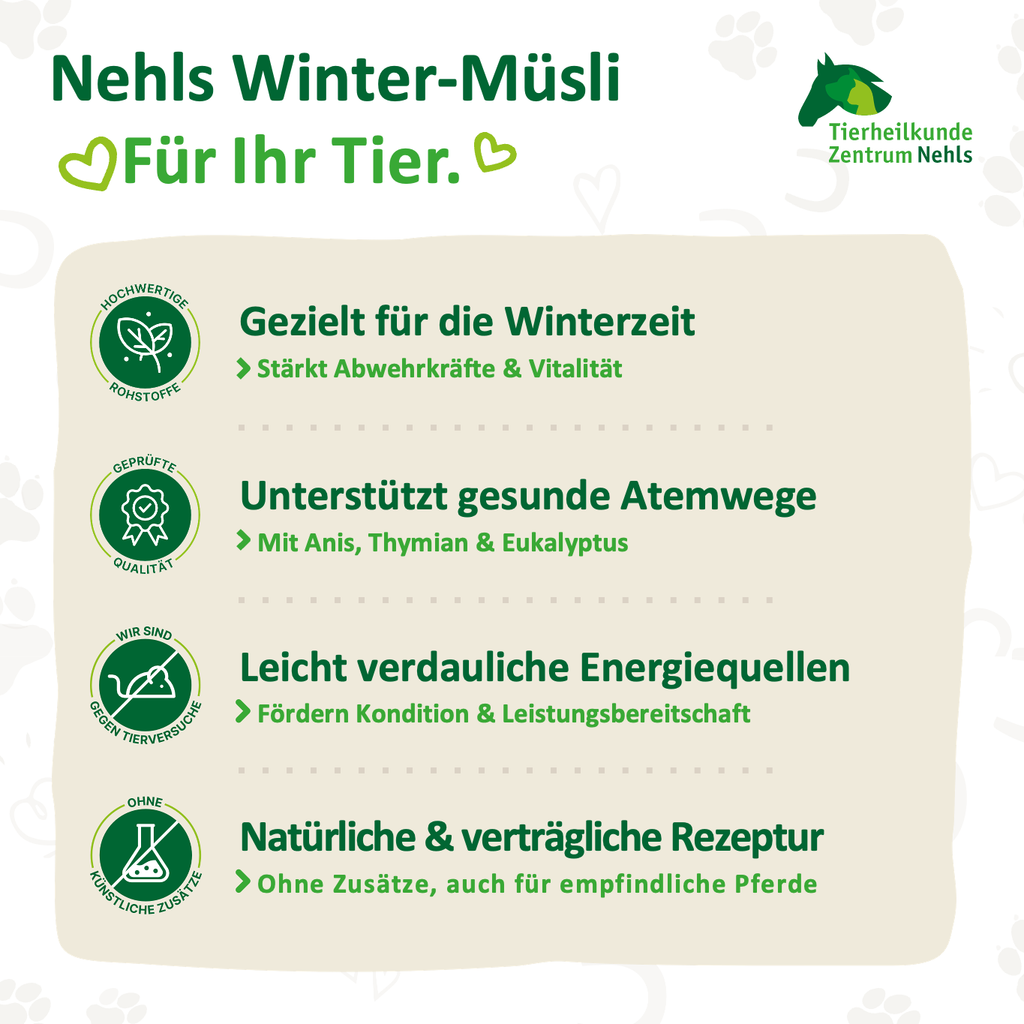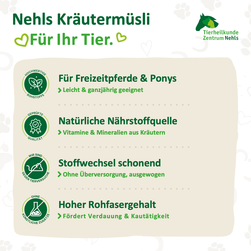 Wir empfehlen daher generell, als natürliche Mineralstoffquelle die passenden Kräuter für Pferde (Nehls Horse Allround Kräuter-Fit, Nehls Pony-Kräuter, Nehls Fohlen-Kräuter bzw. Nehls Senioren-Kräuter, Nehls Kräuter für trächtige und laktierende Stuten) zusätzlich zu füttern und unter das Pferdefutter zu mischen.