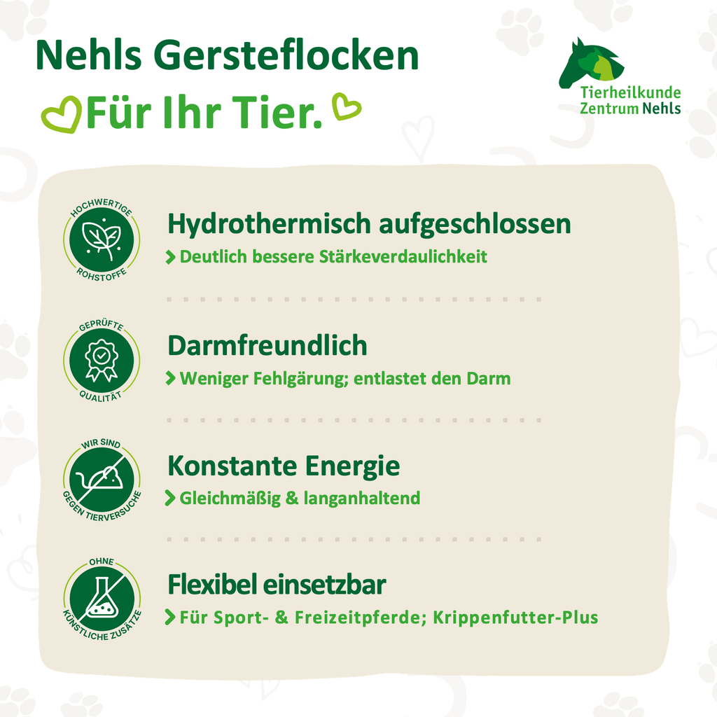 Nehls Pferdefutter enthält ein ausgeglichenes Calcium : Phosphor- und Protein : Energie-Verhältnis. Nehls Pferdefutter ist durch die hydrothermisch aufgeschlossene Flockenform bestens und optimal verwertbar.