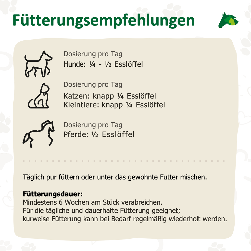 Hunde (je nach Gewicht): ¼ – ½ Esslöffel täglich