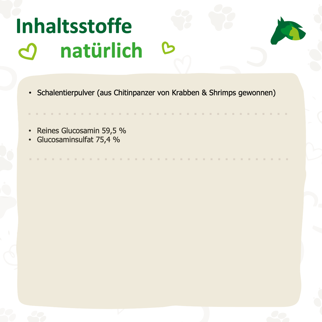 Nehls Gelenk-Stark enthält mit 59,5 % reinem Glucosamin bzw. 75,4 % Glucosaminsulfat eine außergewöhnlich hohe Konzentration – zum Vergleich: Grünlippmuschel enthält nur etwa 2 %. Durch diesen hohen Wirkstoffgehalt ist eine gezielte, wirksame Unterstützung möglich, ohne den Organismus mit unnötigen Zusatzstoffen zu belasten. Besonders in Phasen erhöhter Beanspruchung, bei beginnender Steifigkeit oder bei älteren Tieren kann eine regelmäßige Gabe die Beweglichkeit verbessern, die Regeneration fördern und das Wohlbefinden steigern. Zudem wirkt Glucosamin entzündungshemmend und kann so helfen, Beschwerden zu lindern, die durch Abnutzung oder altersbedingte Veränderungen entstehen.