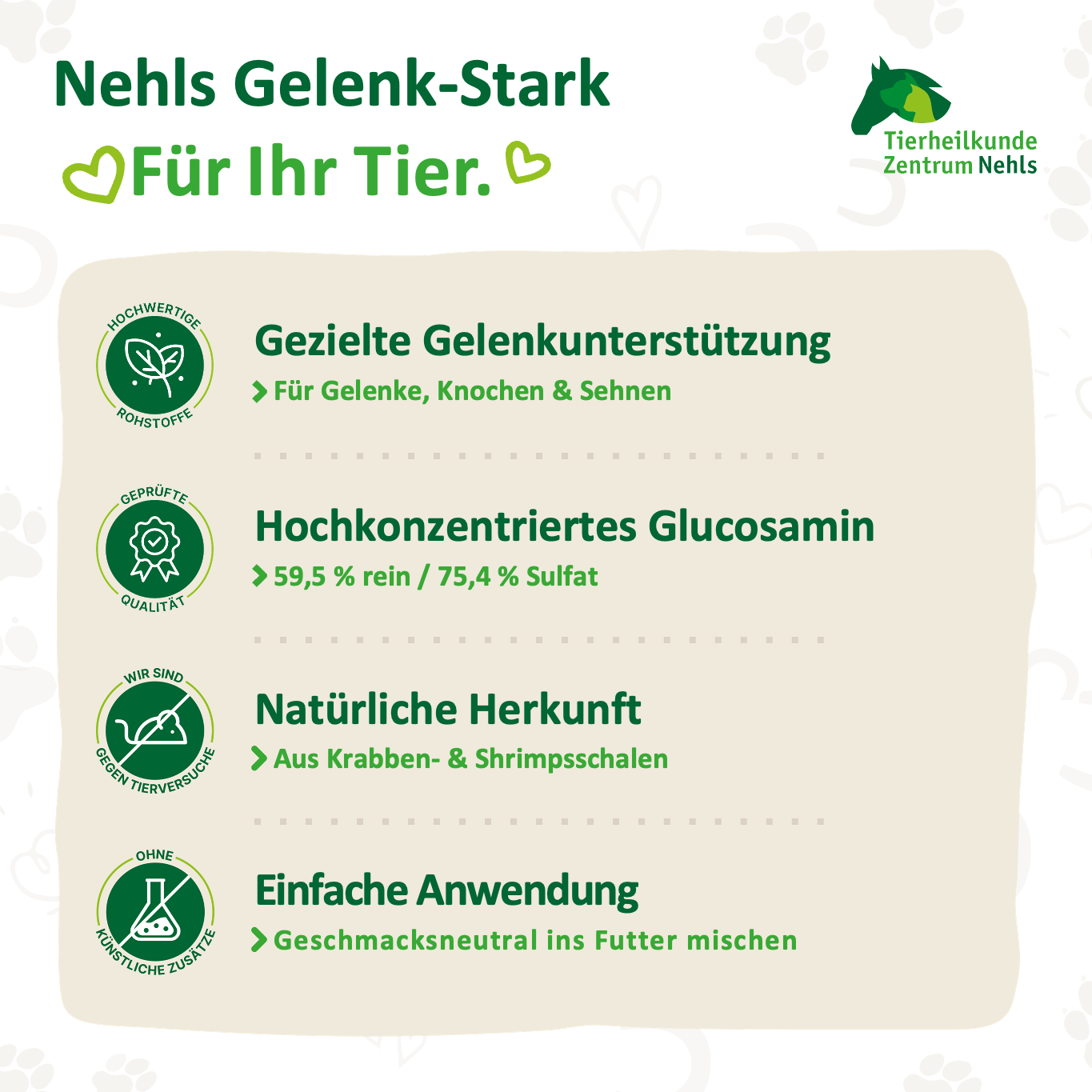 Nehls Gelenk-Stark ist ein hochwertiges Ergänzungsfuttermittel, das speziell zur Unterstützung der Gelenke, Knochen und Sehnen unserer Tiere entwickelt wurde. Mit einem besonders hohen Gehalt an Glucosamin und Glucosaminsulfat liefert es wertvolle Bausteine für die Regeneration und Gesunderhaltung des Bewegungsapparates – ideal sowohl für ältere Tiere als auch für Vierbeiner, die sportlich aktiv sind oder deren Gelenke einer höheren Belastung ausgesetzt werden.
