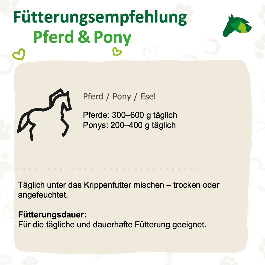 Die enthaltenen Kräuter liefern auf natürliche Weise essentielle Mineralstoffe, Spurenelemente, Vitamine, Aminosäuren und sekundäre Pflanzenstoffe – genau in der Menge, wie sie gesunde und wenig geforderte Freizeitpferde benötigen. So wird der Bedarf optimal gedeckt, ohne den Stoffwechsel zu überfordern.