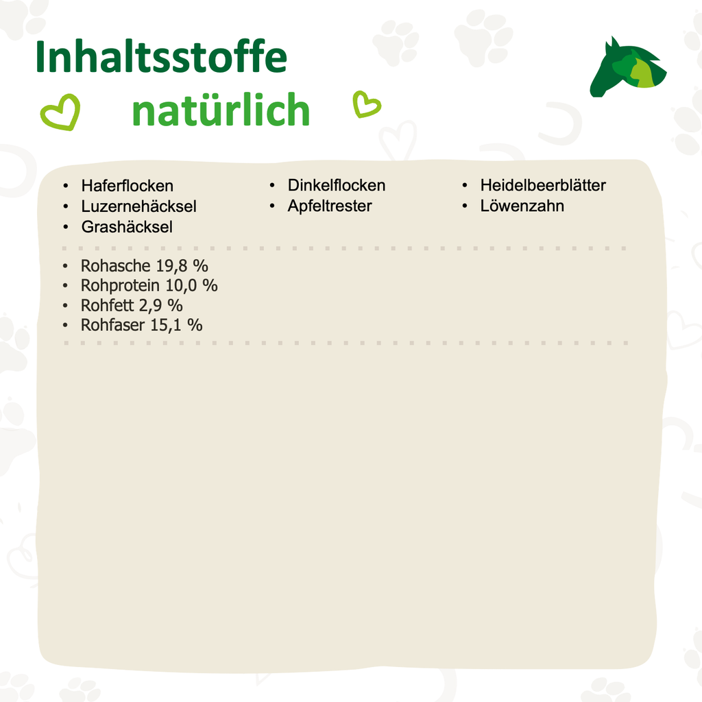 Nehls Kräutermüsli ist daher bewusst so konzipiert, dass es den Organismus entlastet und gleichzeitig alle lebenswichtigen Nährstoffe in natürlicher Form liefert. Enthalten sind wertvolle Pflanzenstoffe wie Vitamin C, Calcium, Phosphor, Magnesium, Zink, Kupfer, Eisen, Mangan, Kieselsäure, Gerbstoffe, Bitterstoffe, ätherische Öle, Schleimstoffe, Chlorophyll, Carotin und viele weitere. Diese Kombination unterstützt nicht nur den Stoffwechsel, sondern auch Haut, Fell, Hufe und das Immunsystem.