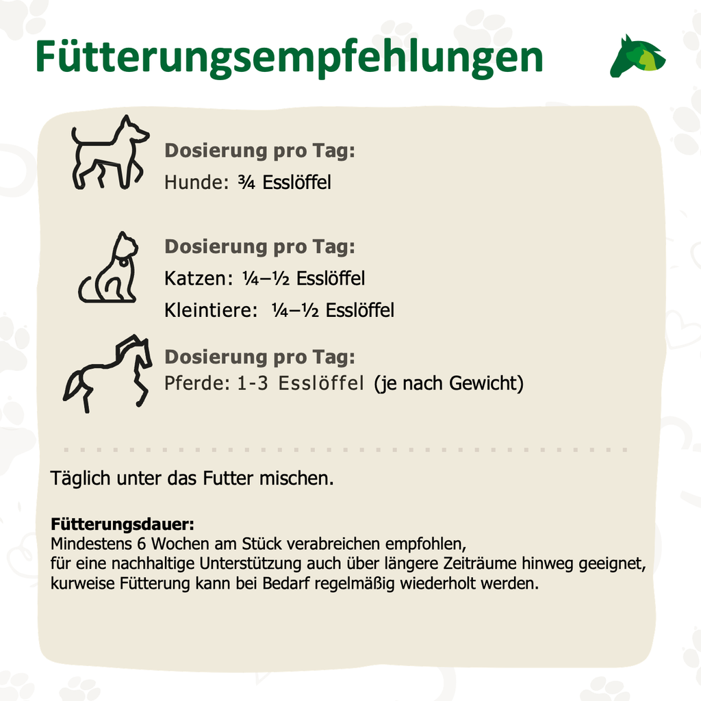 Der enthaltene Zusatz von Bentonit (Bentonit-Montmorillonit) bringt eine weitere wertvolle Eigenschaft: Durch seine außergewöhnliche Bindungsfähigkeit wirkt es wie ein sanfter Schutzschild für den Magen-Darm-Trakt, stabilisiert die Darmflora und unterstützt den Stoffwechsel – besonders bei empfindlichen oder zu Verdauungsproblemen neigenden Pferden. Bentonit hilft, Schadstoffe auszuscheiden, das innere Gleichgewicht zu fördern und die natürliche Vitalität zu bewahren.