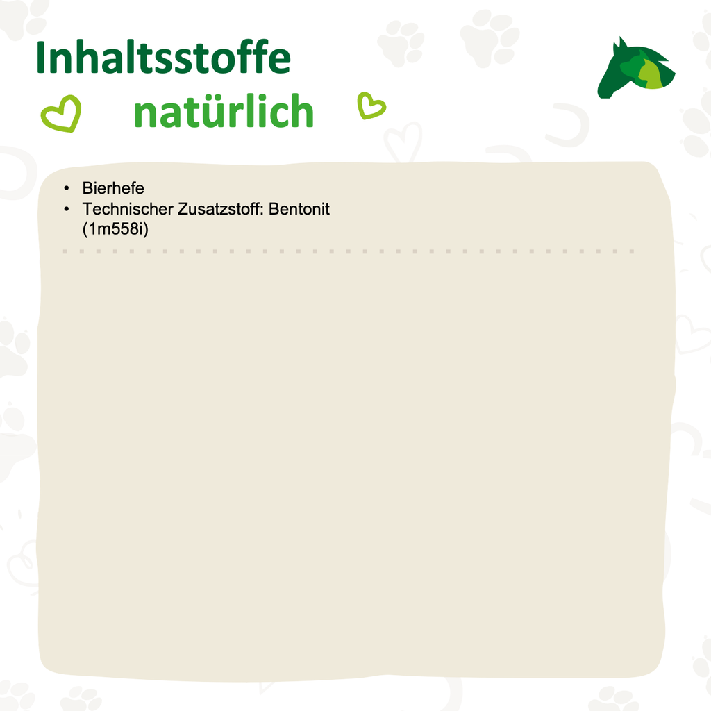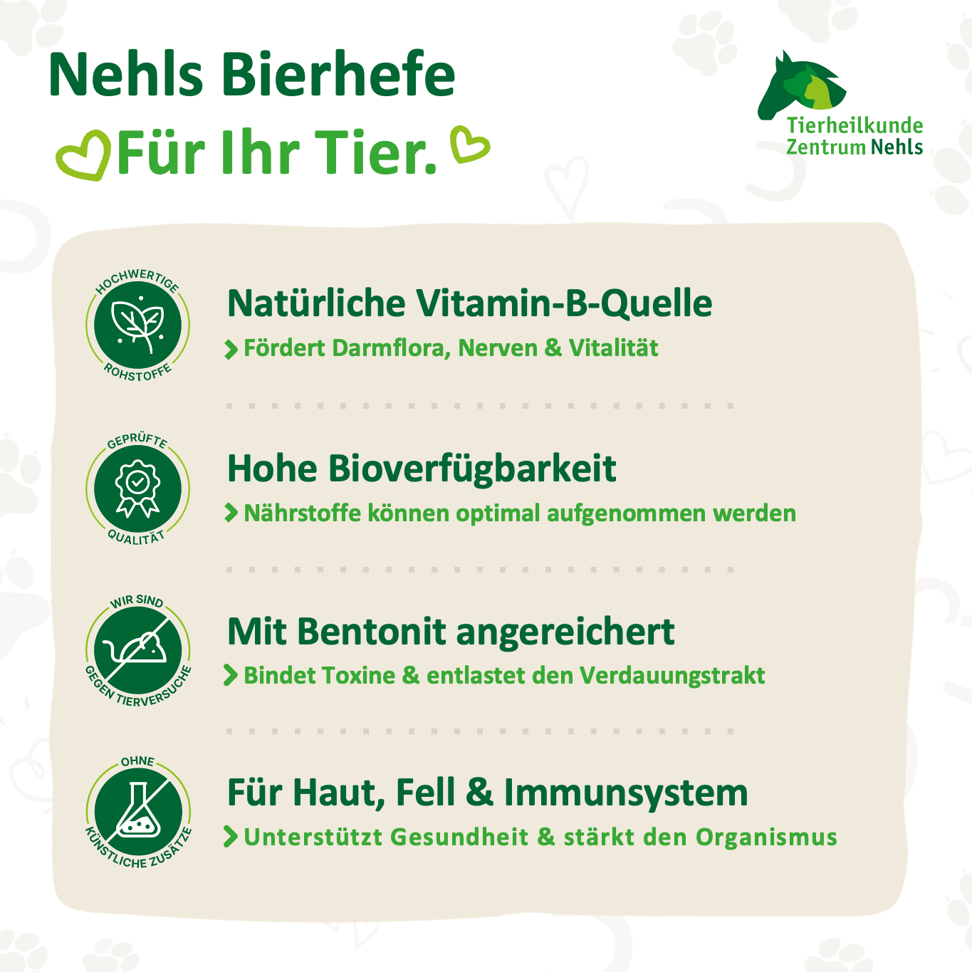 Nehls Bierhefe ist ein hochwertiger, natürlicher Vitamin-B-Lieferant, der sich besonders durch seine erstklassige Bioverfügbarkeit auszeichnet. Vitamin B ist unverzichtbar für eine stabile Darmflora, ein starkes Immunsystem, gesunde Haut, glänzendes Fell sowie ein belastbares Nervensystem. Neben den wertvollen B-Vitaminen enthält Bierhefe auch Aminosäuren, Enzyme und Mineralstoffe in ihrer natürlichen, unveränderten Form.