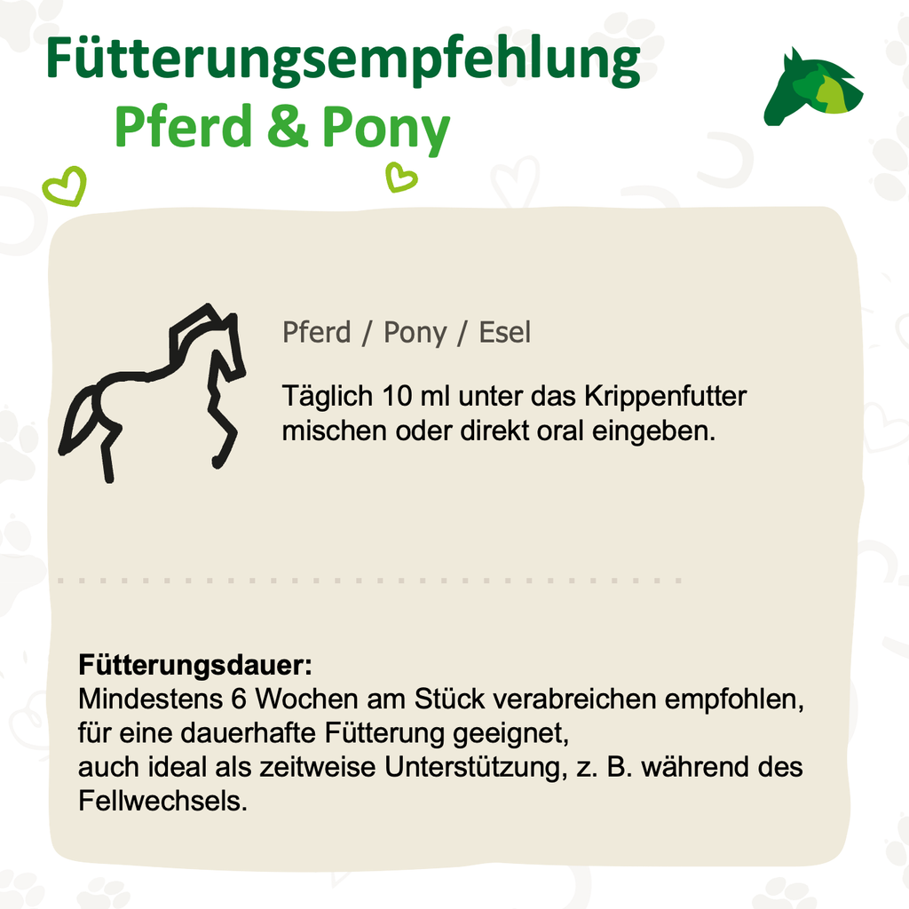 Besonders während des Fellwechsels im Frühjahr und Herbst ist die Mischung ein wertvoller Helfer, um Haut und Organismus zu entlasten. Viele Pferdebesitzer berichten, dass sich die Fellqualität schon nach wenigen Wochen deutlich verbessert, das alte Fell leichter ausfällt und das Pferd insgesamt vitaler wirkt.