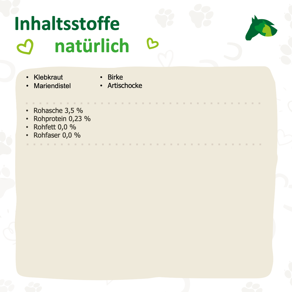 Die enthaltenen Kräuter – Klebkraut, Mariendistel, Artischocke und Birkenblätter – sind seit langem für ihre positiven Eigenschaften auf Stoffwechsel, Haut und innere Reinigung bekannt. Mariendistel unterstützt die Regeneration der Leberzellen, Birkenblätter wirken entwässernd und stoffwechselanregend, Klebkraut fördert den Lymphfluss und Artischocke trägt zur Fettverdauung und Entgiftung bei. Zusammen bilden sie eine harmonische, rein natürliche Mischung, die ohne synthetische Zusätze auskommt und auch für sensible Pferde geeignet ist.