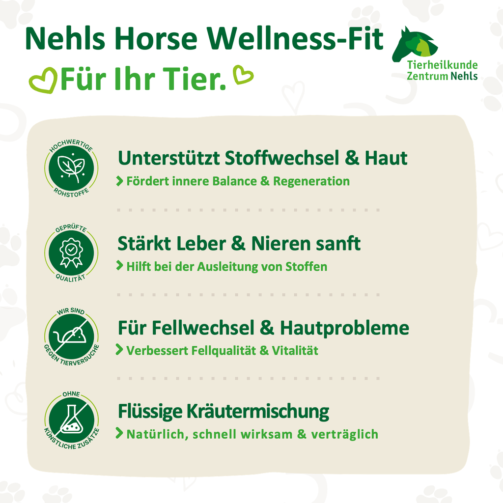 Die besondere flüssige Darreichungsform ermöglicht eine schnelle Aufnahme der wertvollen Inhaltsstoffe, sodass die Wirkung zeitnah einsetzen kann. Ob zur dauerhaften Unterstützung oder als gezielte Kur – Nehls Horse Wellness-Fit bietet eine natürliche, ganzheitliche Pflege von innen heraus, die sichtbar positive Effekte auf Haut, Fell und Vitalität hat.