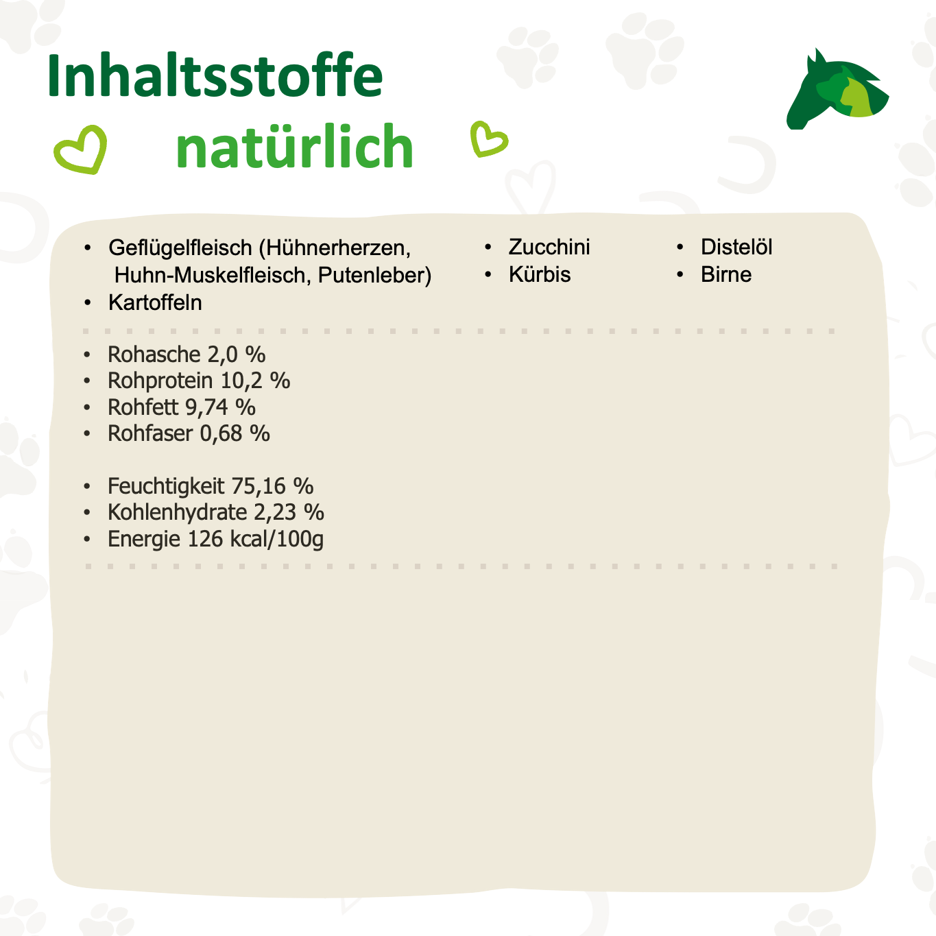 Huhn und Pute liefern leicht verdauliches, mageres Eiweiß, das den Organismus mit essentiellen Aminosäuren versorgt und den Muskelaufbau unterstützt. Gemüse und Birne bringen wertvolle Ballaststoffe, Vitamine und sekundäre Pflanzenstoffe in den Napf, während Distelöl hochwertige ungesättigte Fettsäuren liefert, die Haut und Fell pflegen und das Immunsystem stärken.