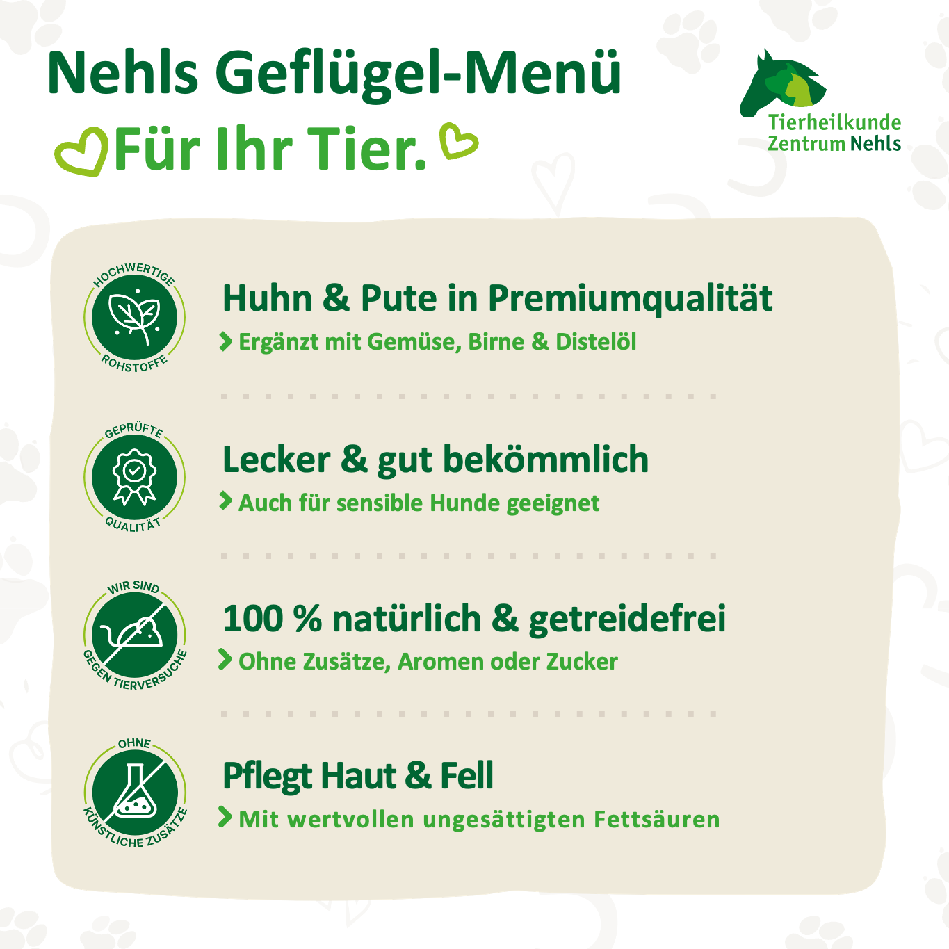 Mit Nehls Geflügel-Menü entscheiden Sie sich für eine vollwertige, naturbelassene und wohlschmeckende Mahlzeit, die Ihren Hund täglich mit allem versorgt, was er für Gesundheit, Vitalität und Lebensfreude braucht.