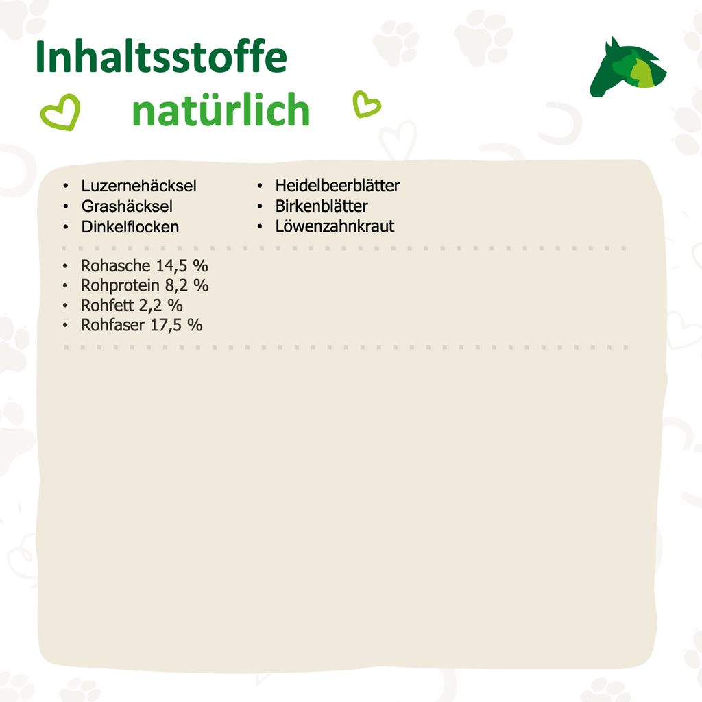 Der hohe Rohfaseranteil sorgt für ein langanhaltendes Sättigungsgefühl und unterstützt gleichzeitig eine gesunde Verdauung. So kann auch eine kleine Menge des Futters für Zufriedenheit und Beschäftigung sorgen. Wie bei allen Nehls Produkten stammen die enthaltenen Mineralstoffe, Spurenelemente und Vitamine ausschließlich aus natürlichen Quellen – auf synthetische Zusätze wird konsequent verzichtet.