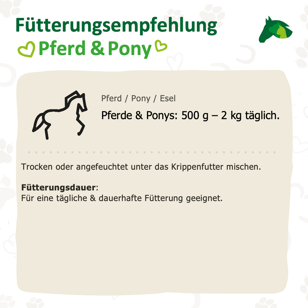 Durch die schonende Aufbereitung werden die enthaltenen Nährstoffe für das Pferd besonders gut verfügbar gemacht. So können Energie, Mineralstoffe und Spurenelemente effizient verwertet werden – ein klarer Vorteil für eine gesunde, leistungs- und vitalitätsfördernde Fütterung.