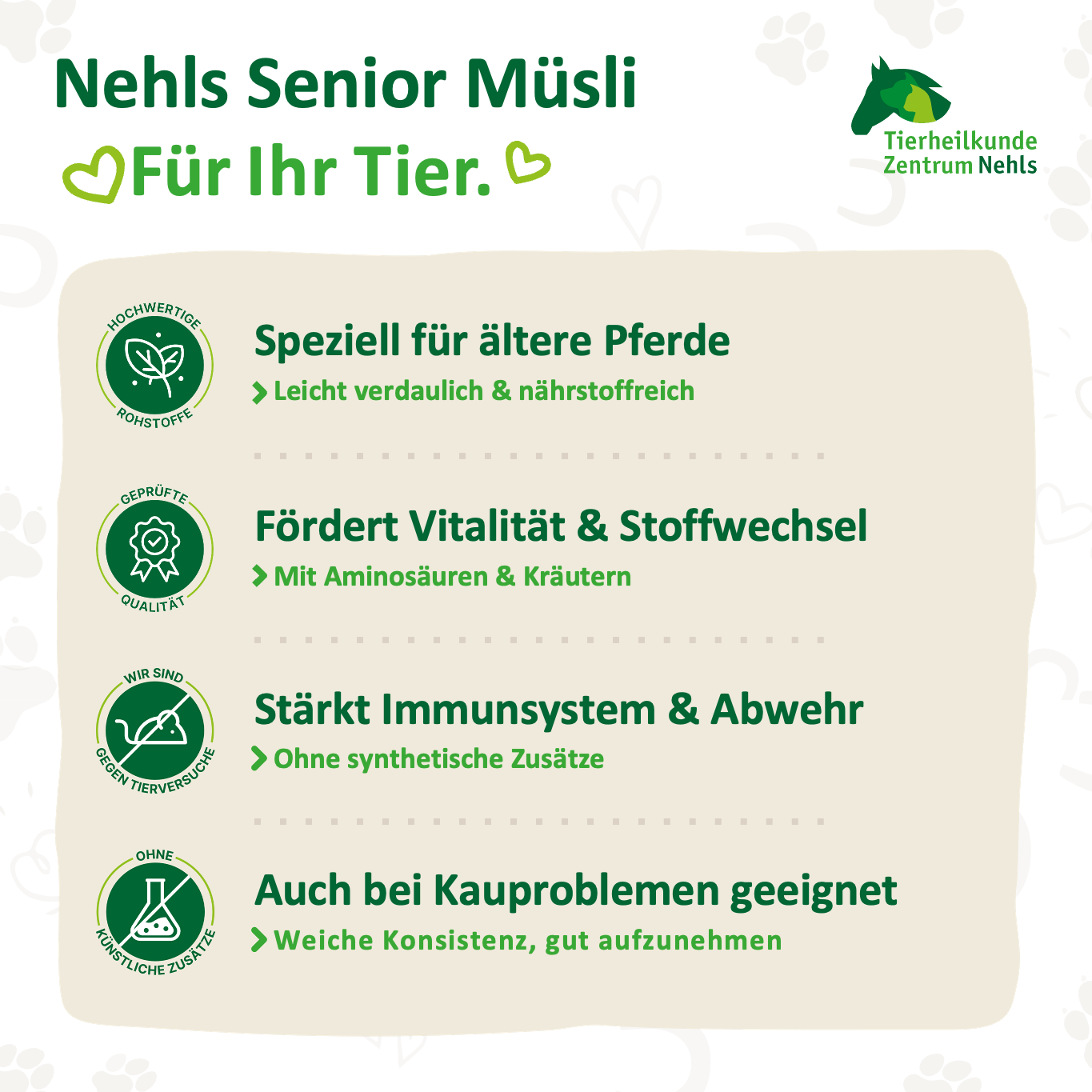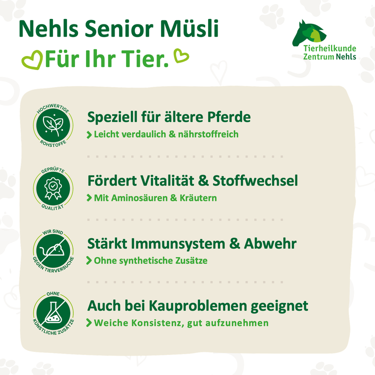 Die Kombination aus schnell verfügbaren Aminosäuren und natürlich vorkommenden Mineralstoffen, Spurenelementen und Vitaminen aus Kräutern unterstützt gezielt das Wohlbefinden, die Vitalität und die Stoffwechselfunktion. Dabei verzichtet Nehls Senior Müsli konsequent auf synthetische Zusätze, um den Organismus nicht zu belasten und das Immunsystem zu stärken.